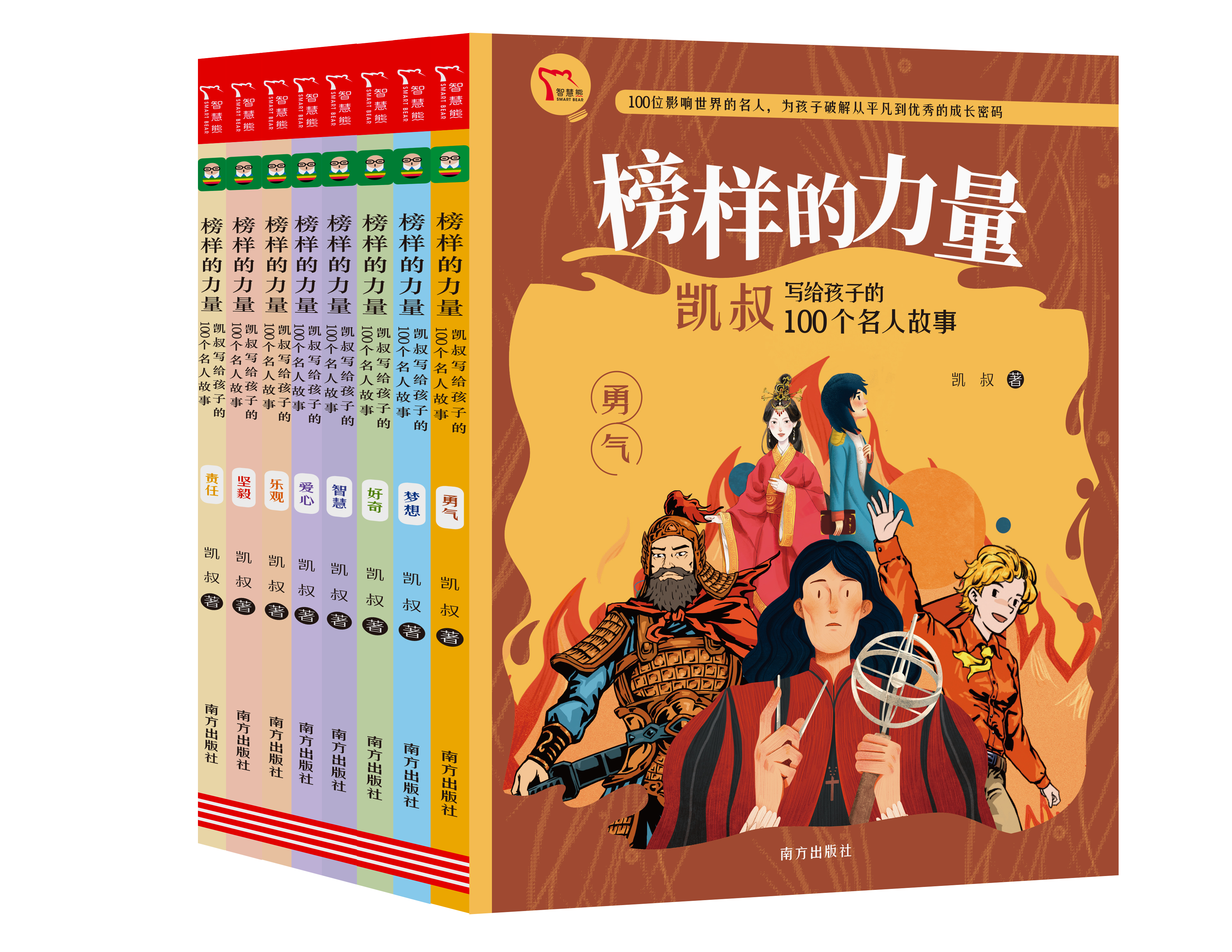 《榜样的力量:凯叔写给孩子的100个名人故事》是著名主持人、声音表演艺术家、作家凯叔专门为少年儿童量身定制的中外名人故事集。全书内容横跨3000年历史,选取了100个影响世界的名人榜样,涵盖历史、政治、科学、经济、军事、哲学、文艺、体育八大领域,涉及26个国家、16个行业。这套书根据孩子成长中至关重要的8种优秀品质分成了8册——勇气、梦想、智慧、坚毅、乐观、爱心、好奇、责任,包含近300个“历史现场”,不仅能让孩子在“沉浸式”阅读中直观地感受名人的传奇人生,还能让他们看到并学习名人身上优秀、突出的品格,汲取榜样力量,树立少年志向